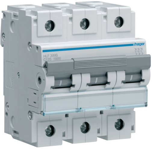 Автоматичний вимикач 125 А, 3P характеристика С 10 kA, Hager HLF399S. Займане місце на DIN — рейці 4.5 модуля.